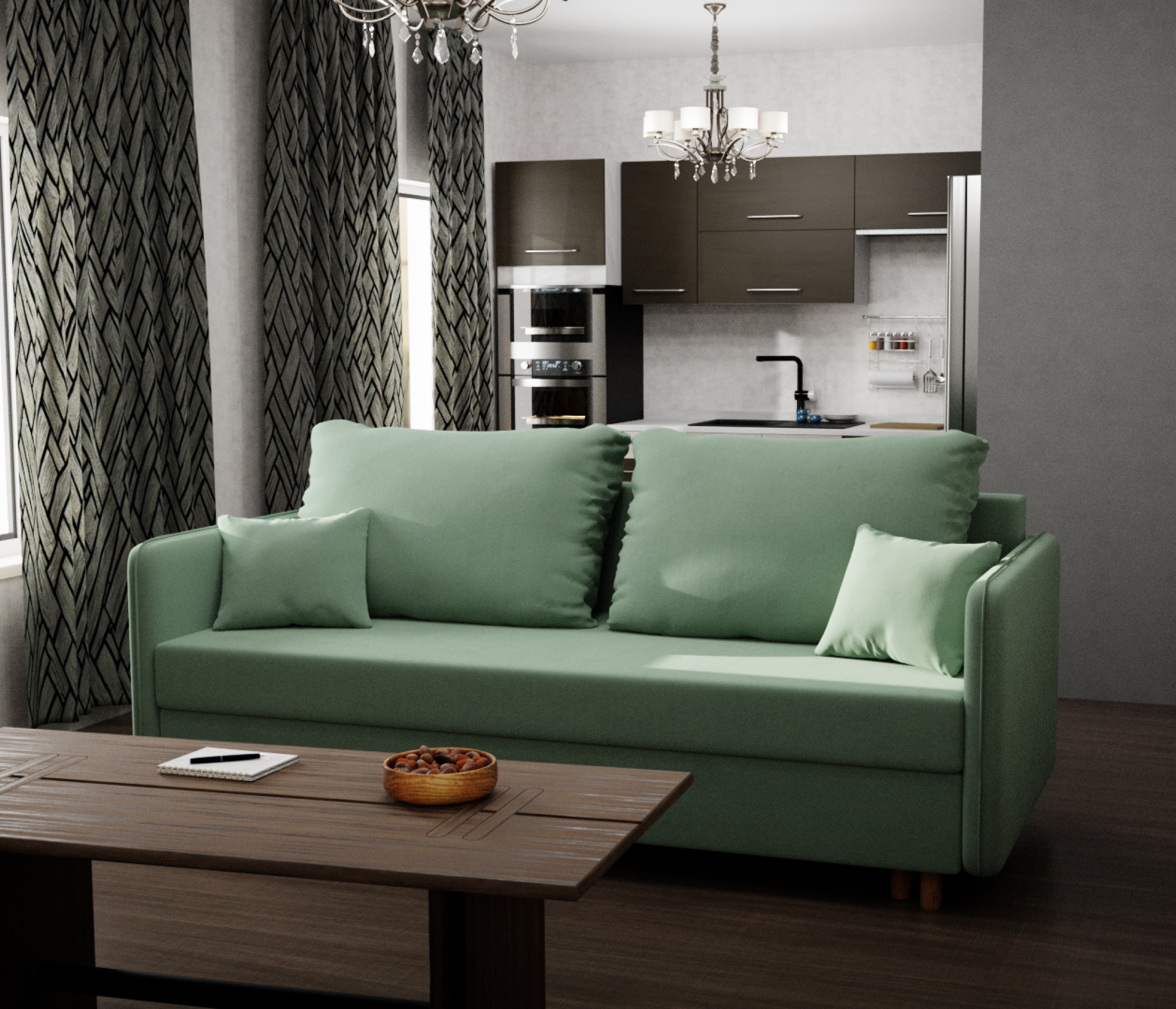 Диван-кровать оснащен механизмом трансформации "еврокнижка" и ящиком для хранения белья. Обивка выполнена из мягкого и приятного на ощупь велюра. Цвет дивана "фисташковый", что делает его универсальным и гармоничным для многих интерьеров.