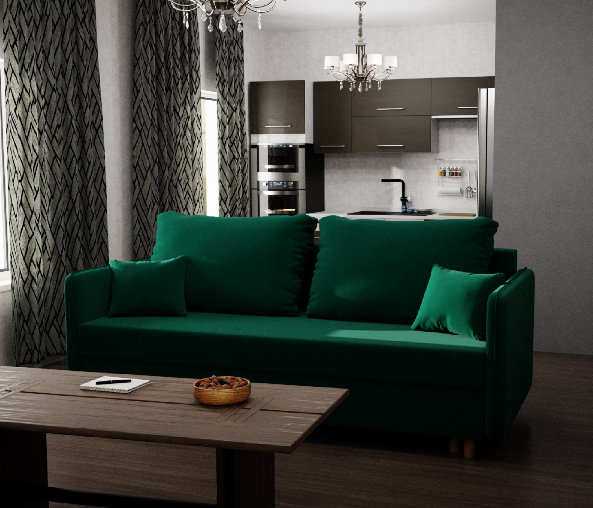 Диван-кровать оснащен механизмом трансформации "еврокнижка" и ящиком для хранения белья. Обивка выполнена из мягкого и приятного на ощупь велюра. Цвет дивана "фисташковый", что делает его универсальным и гармоничным для многих интерьеров.