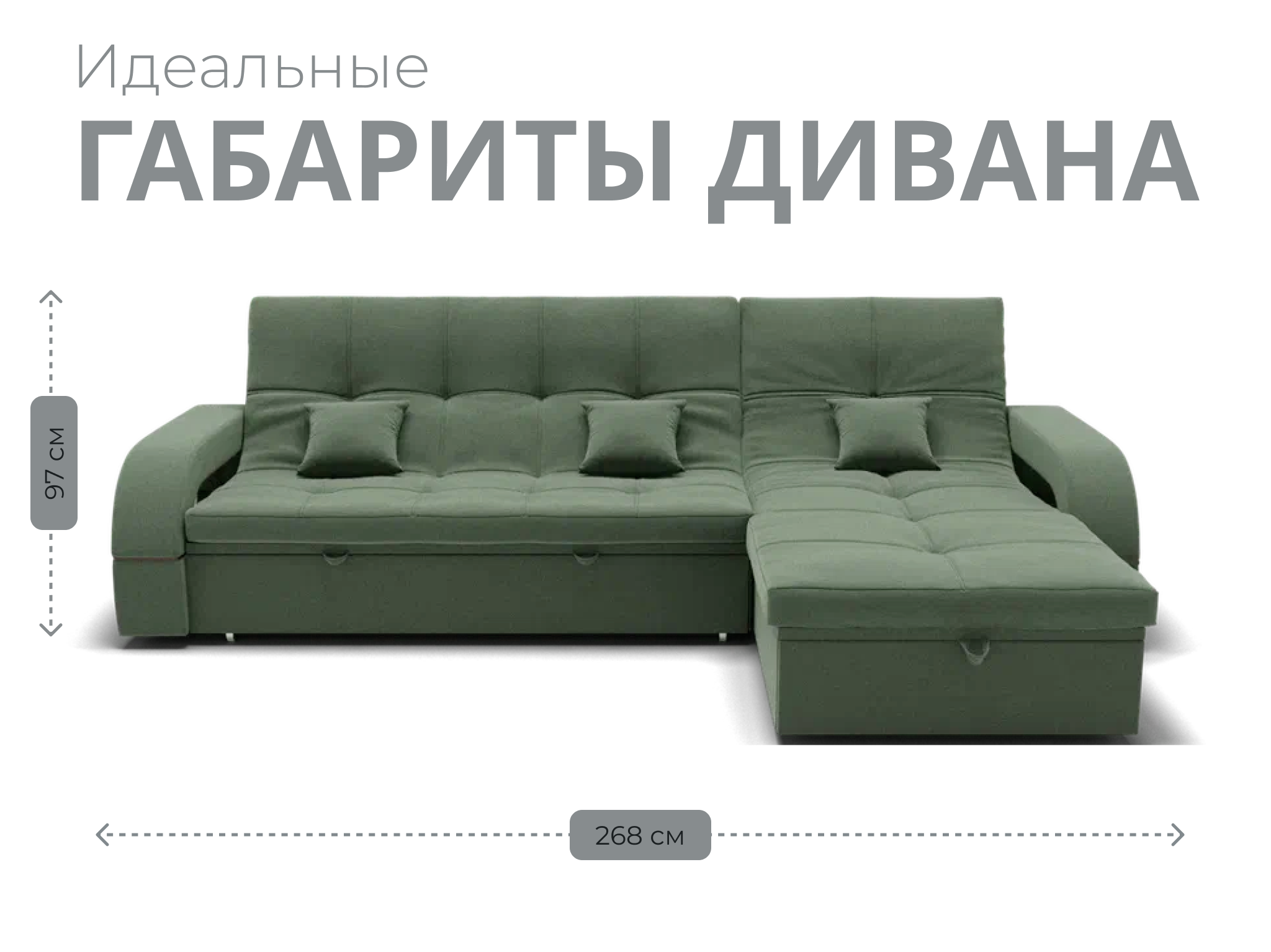 Он имеет высоту 97 см, ширину 268 см и глубину 175 см. Диван обладает универсальным расположением угла, что позволяет его использовать в любом помещении.