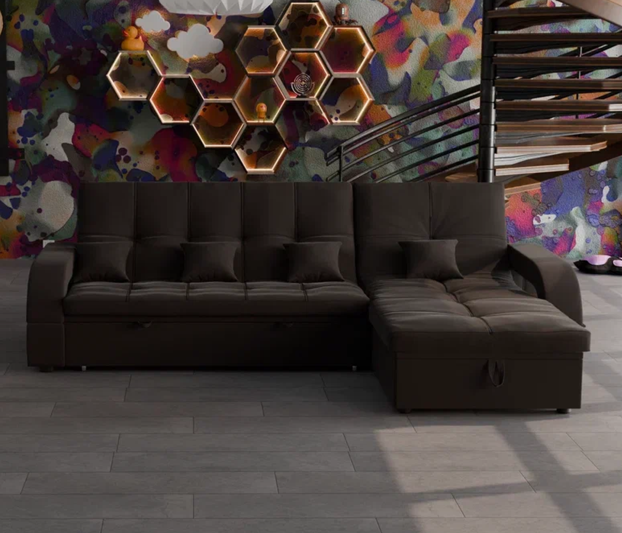 Он имеет высоту 97 см, ширину 268 см и глубину 175 см. Диван обладает универсальным расположением угла, что позволяет его использовать в любом помещении.