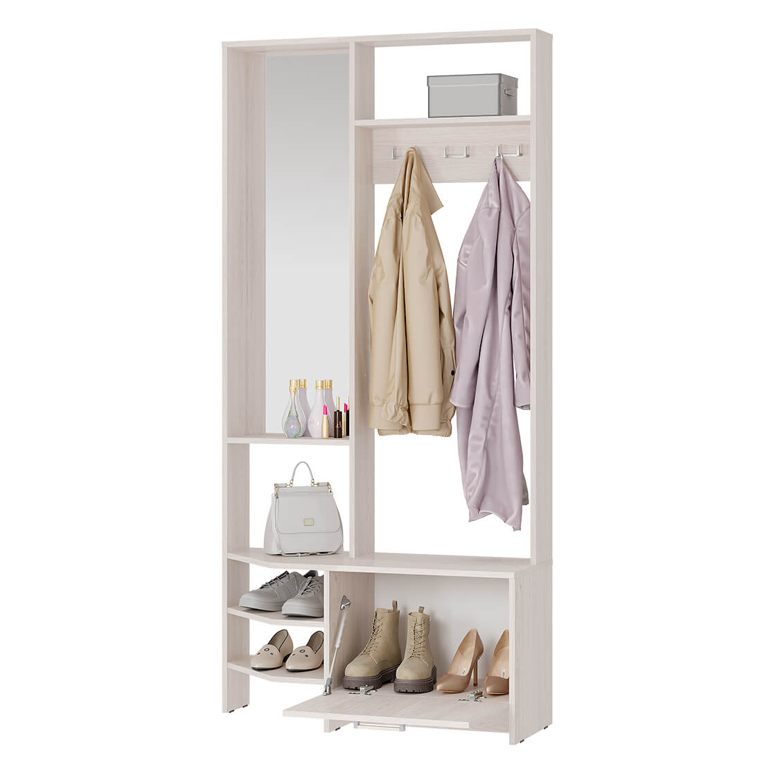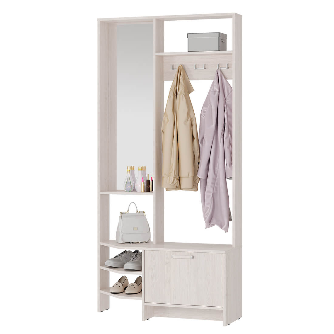 Компактная прихожая Тео – готовое решение для современной малогабаритной прихожей. Здесь есть все составляющие – зеркало с полкой для разных полезных мелочей, верхняя полка для головных уборов, просторная зона с крючками для верхней одежды, нижние открытые и закрытые полки, в которых можно хранить сезонную обувь. Регулируемые опоры позволяют установить прихожую на любой неровной поверхности. Высокое качество по приятной цене — это прихожая Тео.