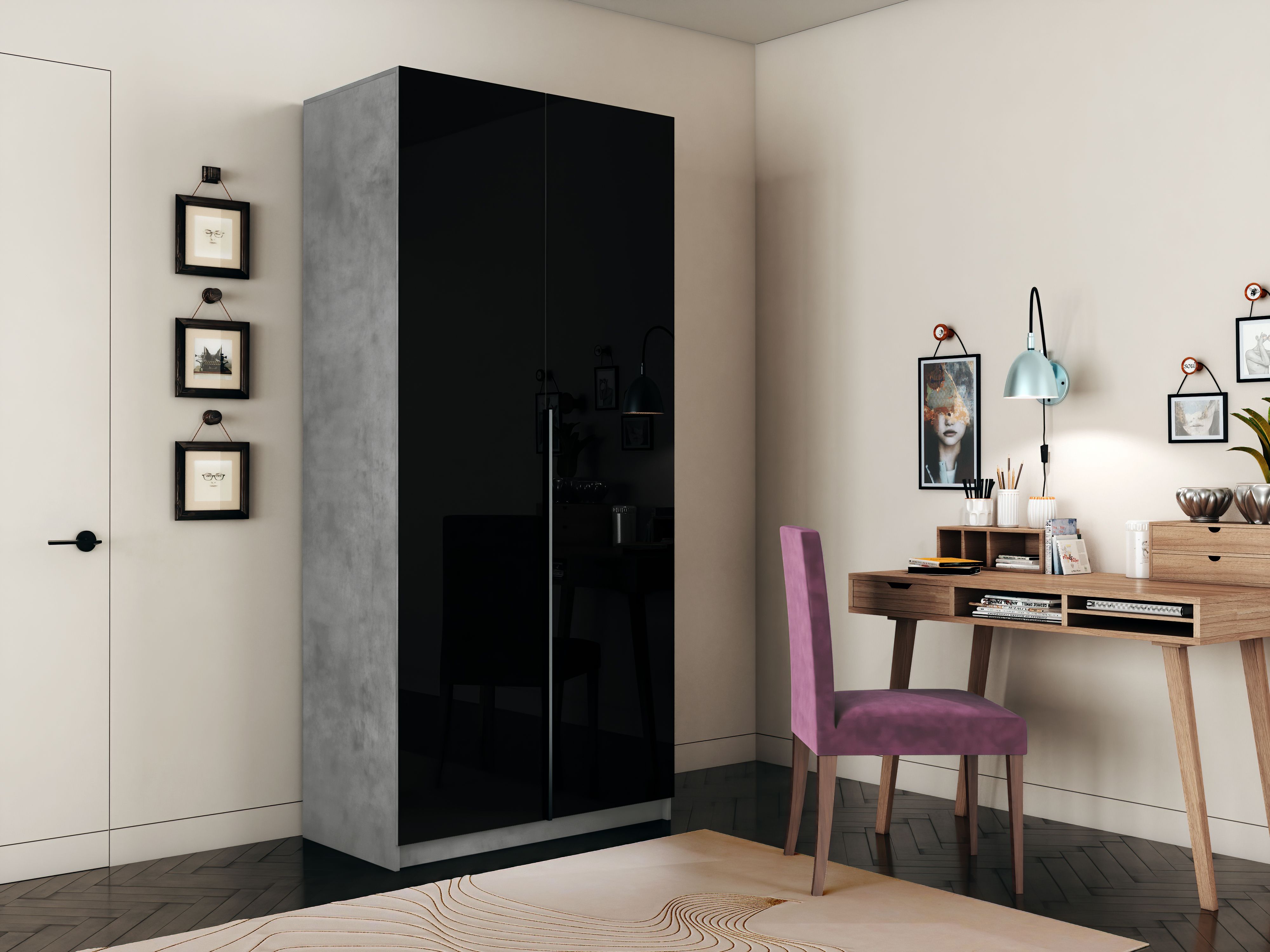 Шкаф распашной Е1 Локер 101x52.5x220 см, с черным стеклом , полками и модулем (бетон)