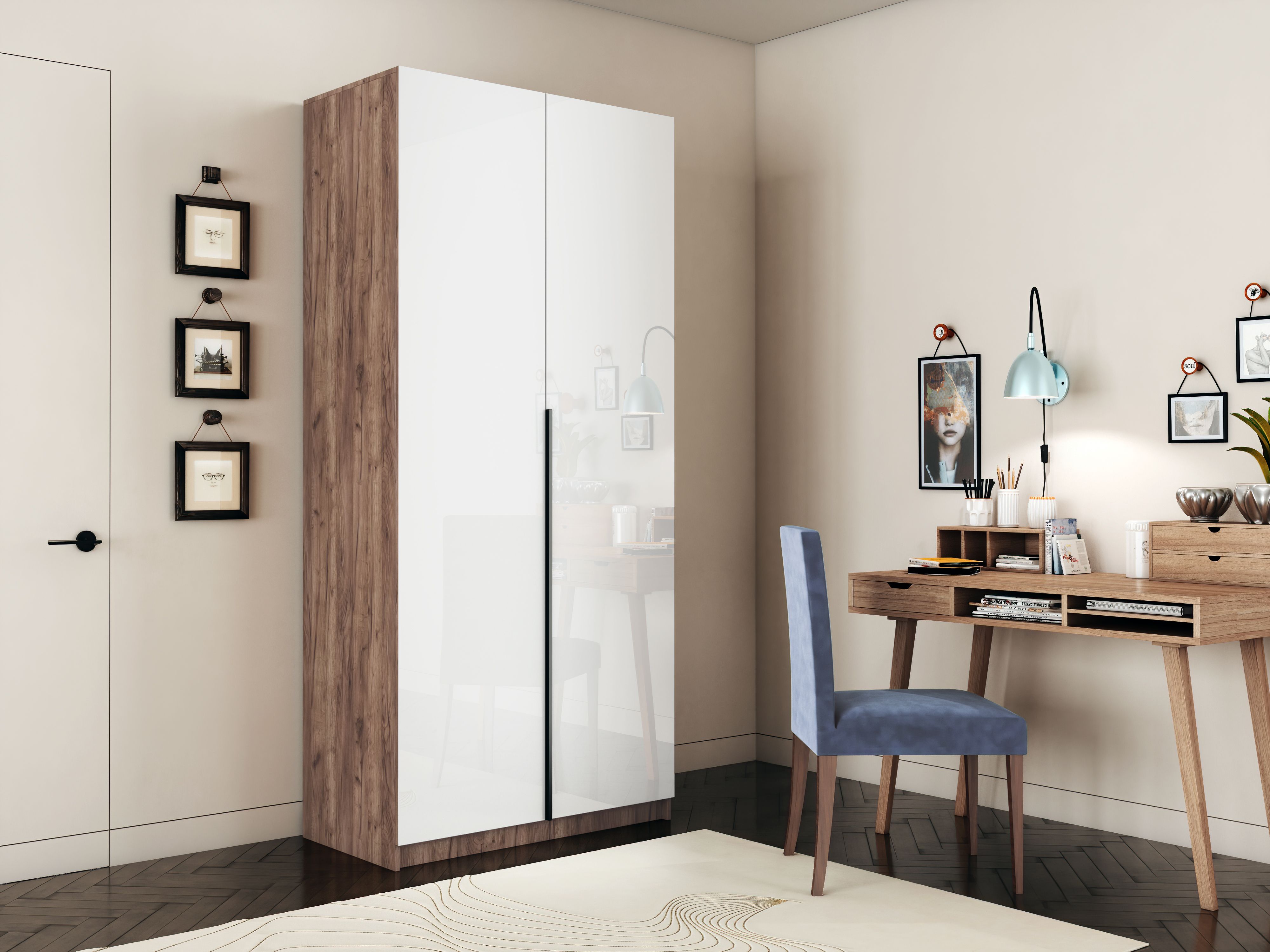 Шкаф оснащен удобной минималистичной ручкой, изготовленной из алюминия.