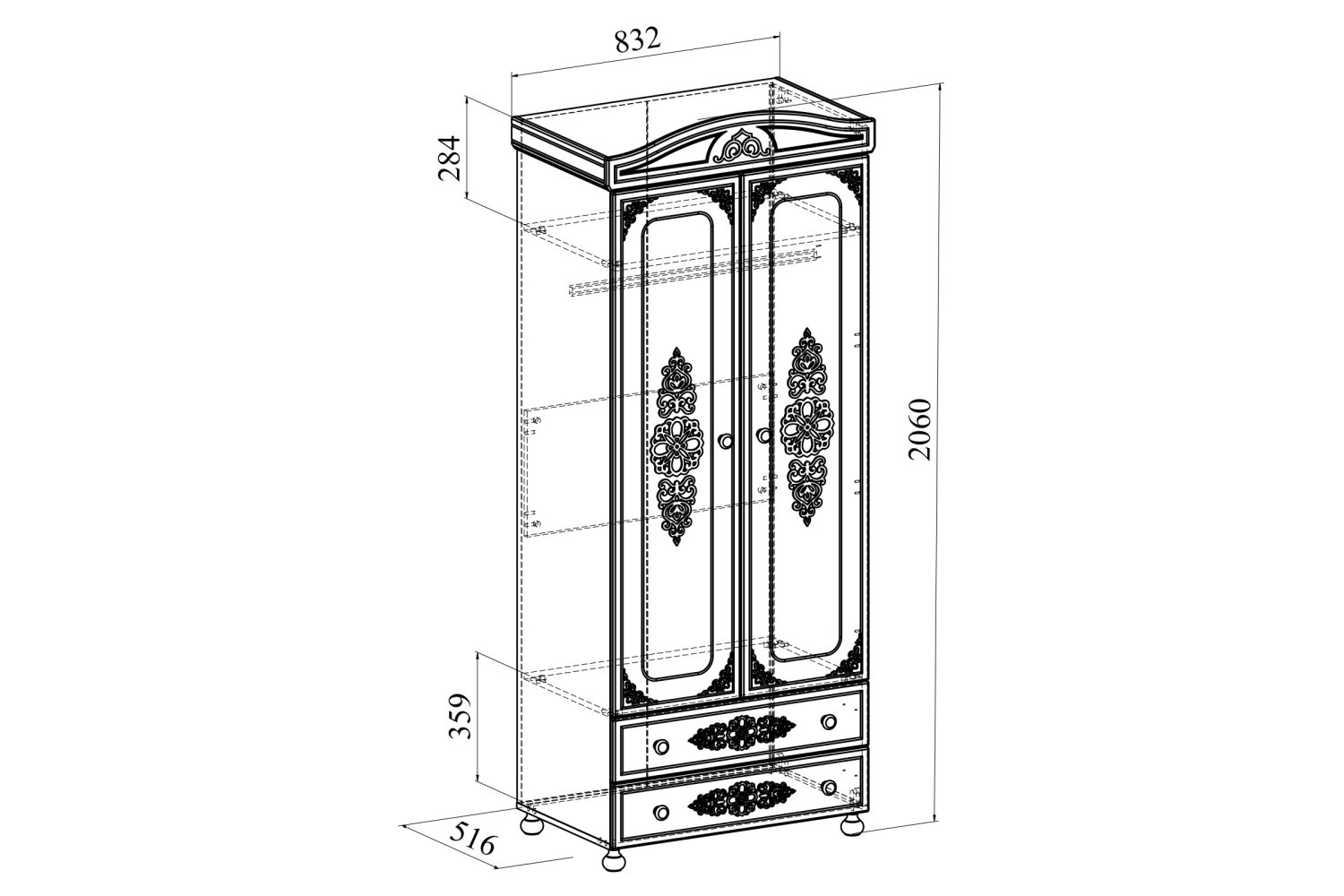 Платяной шкаф с двумя дверцами и двумя выдвижными ящиками. Высота боковых стенок каждого ящика 130 мм, ширина ящика 708 мм, глубина 450 мм. Ящики установлены на телескопических направляющих полного выдвижения. В верхней части шкафа расположена полка высотой 260 мм. Под полкой расположена штанга для плечиков.