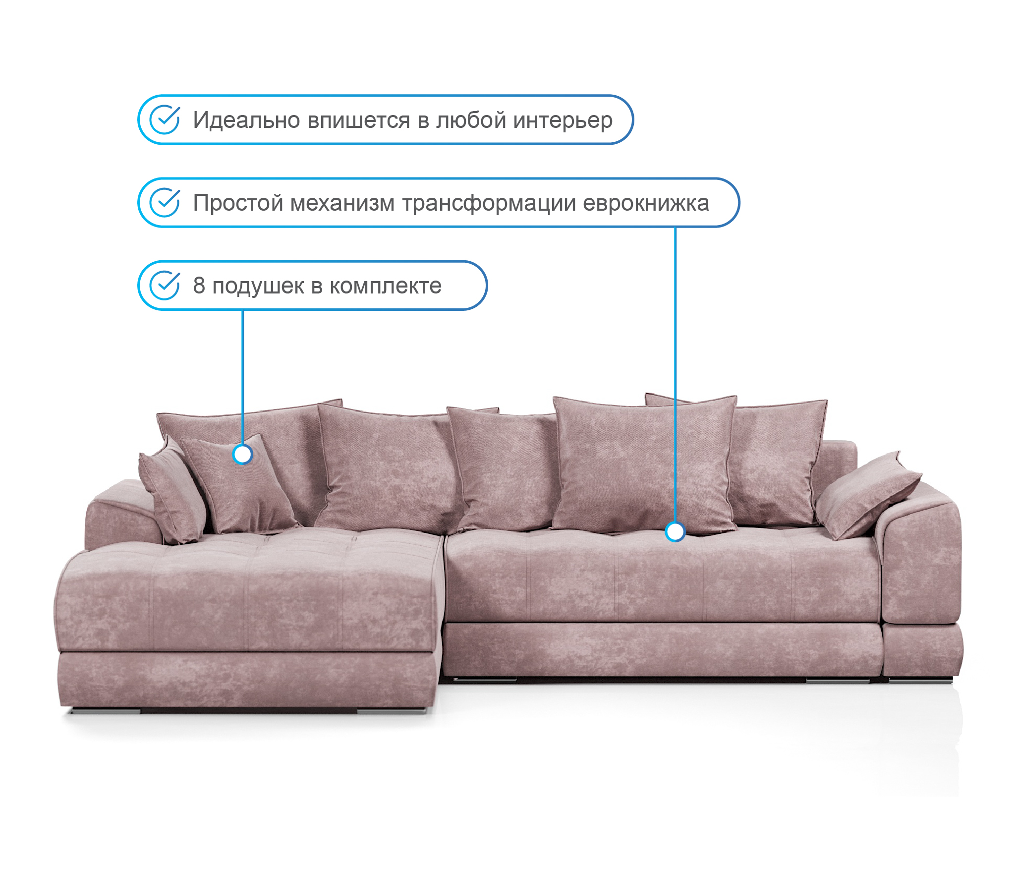 Механизм трансформации. Диван оснащен механизмом Еврокнижка, с которым знаком каждый. Механизм предназначен для ежедневной эксплуатации.