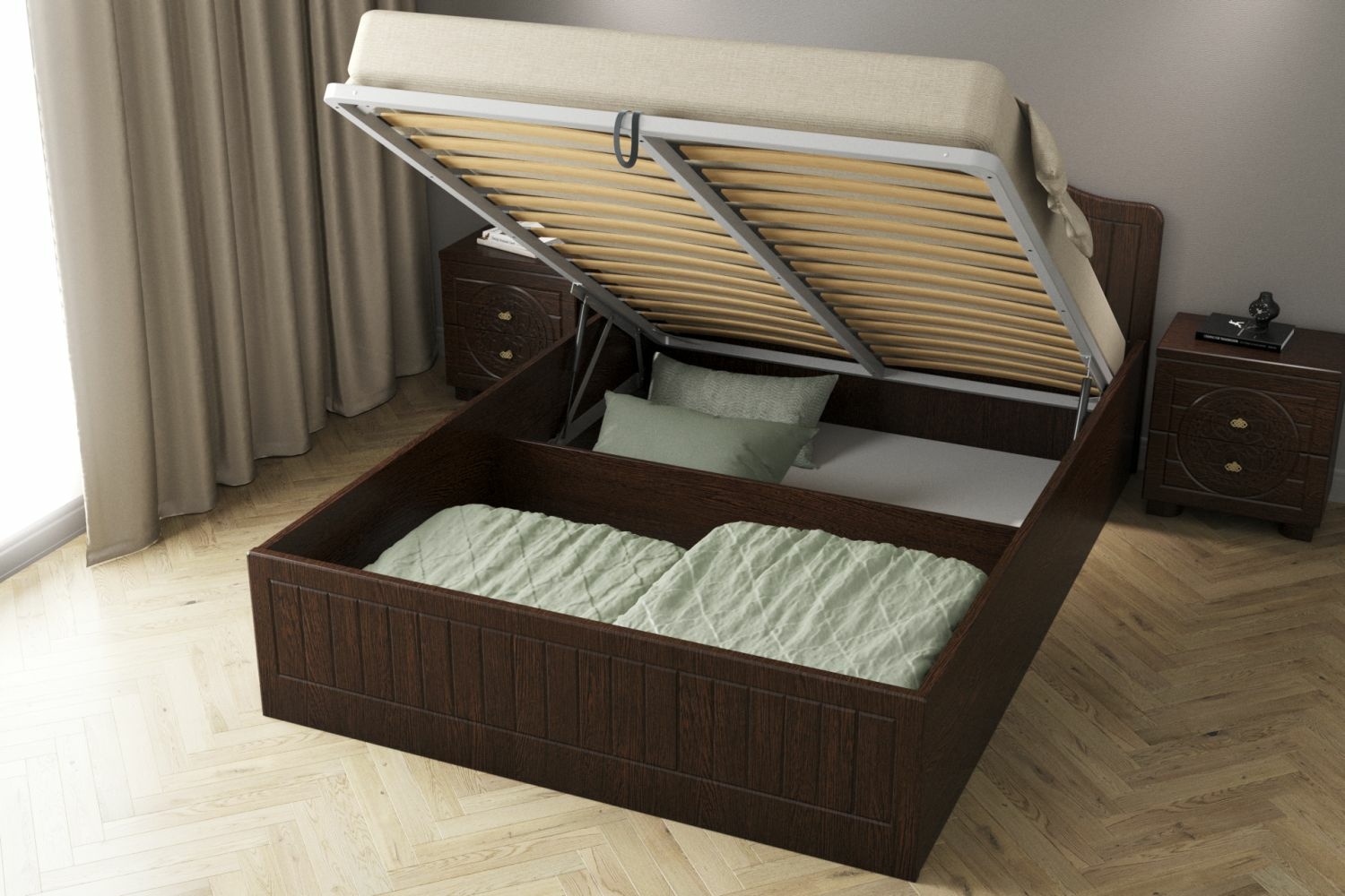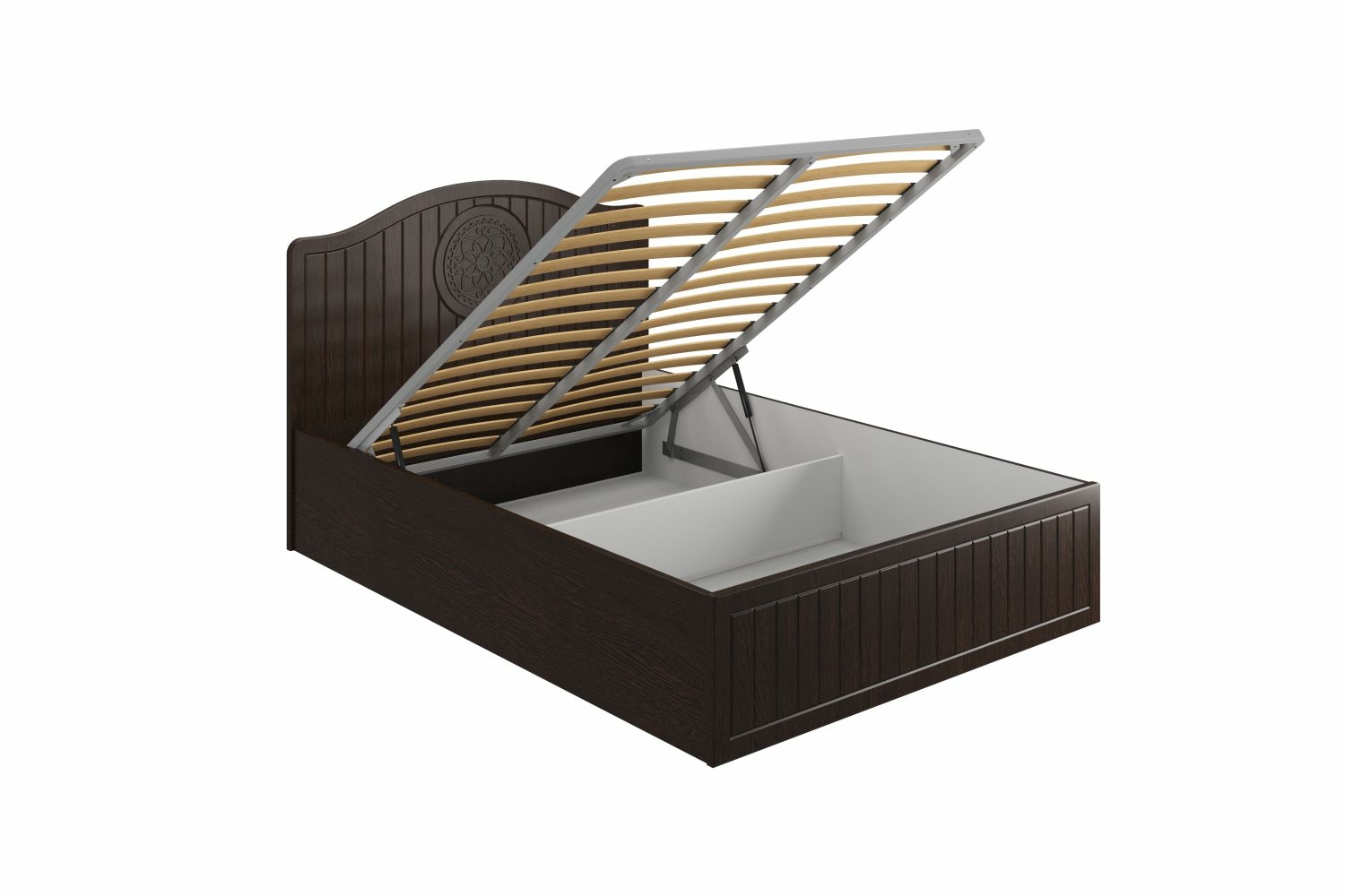 Материал корпуса/фасада: ЛДСП/МДФ. Цвет корпуса/фасада: белое дерево. Размеры модуля (в/ш/г) в мм: 1130х1492х2070. Основание кровати: ламели с подъемным механизмом. Особенности: короб для хранения постельного белья.