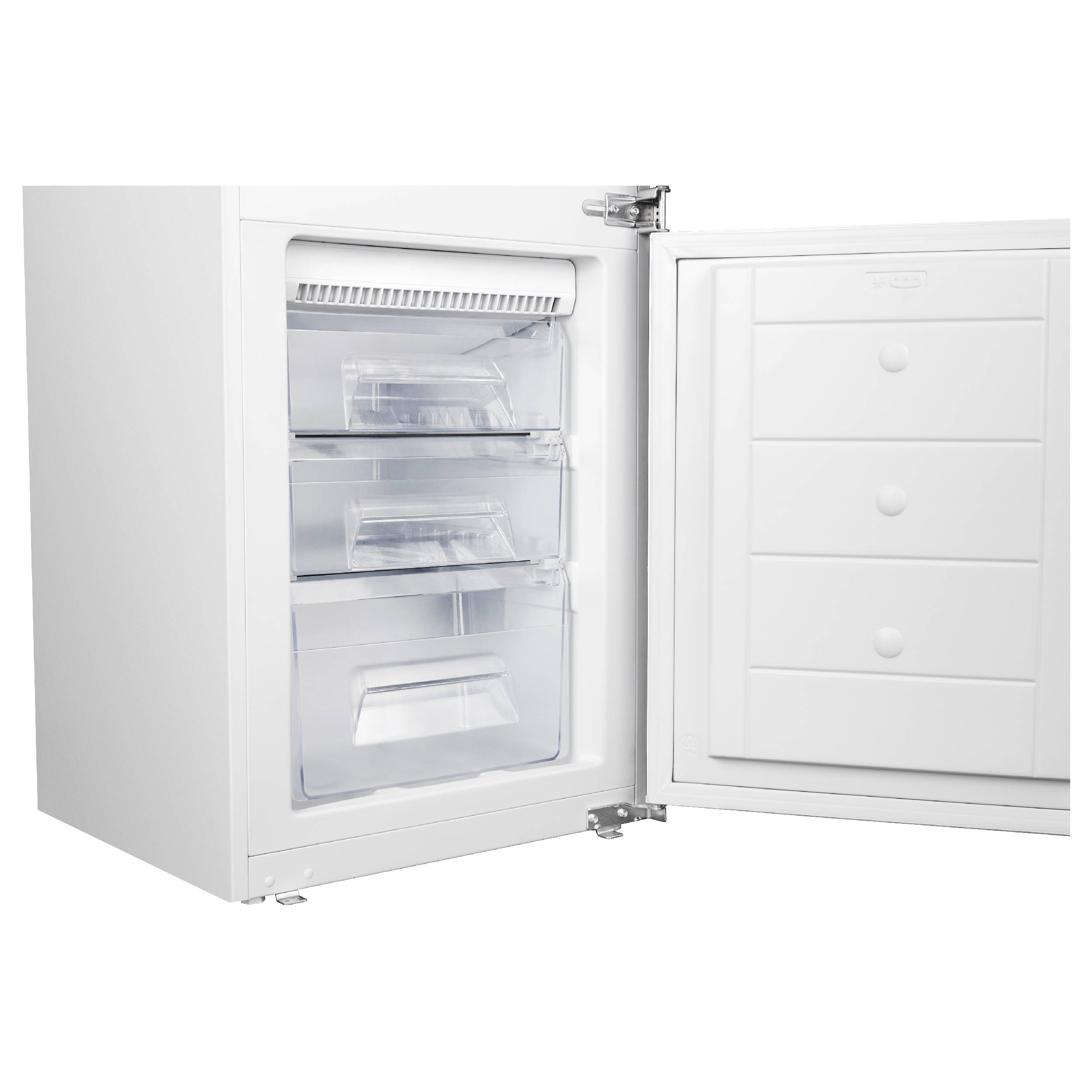 Встраиваемый холодильник-морозильник с функцией No Frost морозильного отделения, класс энергопотребления: A+, электронное управление с LED индикацией, динамическое охлаждение камеры Fresh Air Cooling, 4 стеклянные полки с хромированной отделкой в х/о, 3 полноразмерные прозрачные дверные полки с хромированной отделкой, большой ящик для овощей и фруктов, 2 подставки для яиц, LED освещение х/о. Количество компрессоров: 1. Мощность замораживания (кг/24 ч): 3,0. Длительность сохранения холода при отключении электроэнергии (ч): 11. Перенавешиваемые двери, слайдерное крепление. Объем нетто холодильного отделения, л: 182, объем нетто морозильного отделения, л: 56, уровень шума 41 дБ, 1769х540х540 мм.
