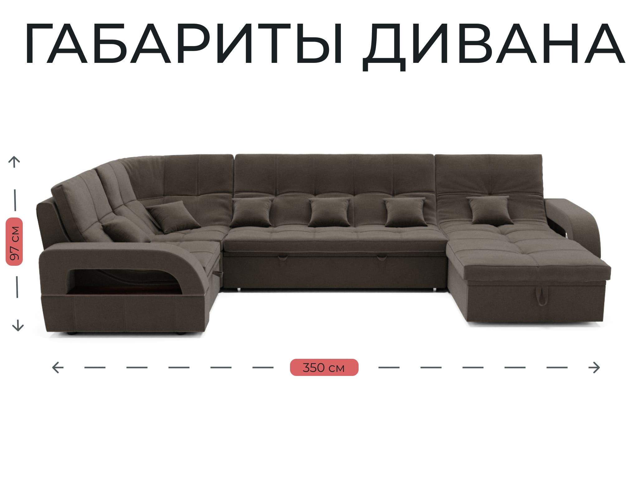 Он имеет высоту 97 см, ширину 350 см и глубину 187 см. Обит велюром - Veluta lux. Диван обладает универсальным расположением угла, что позволяет его использовать в любом помещении.